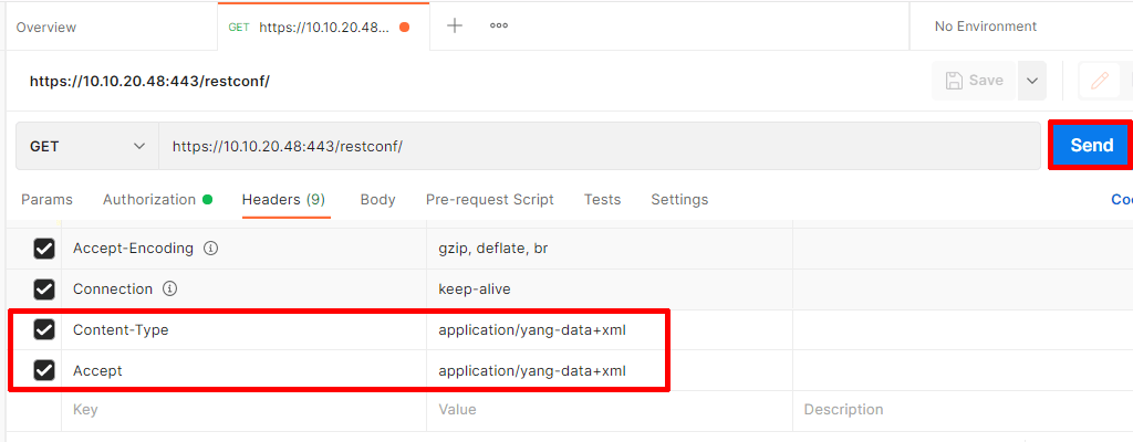 На закладке Headers, сначала XML, application/yang-data+xml:
