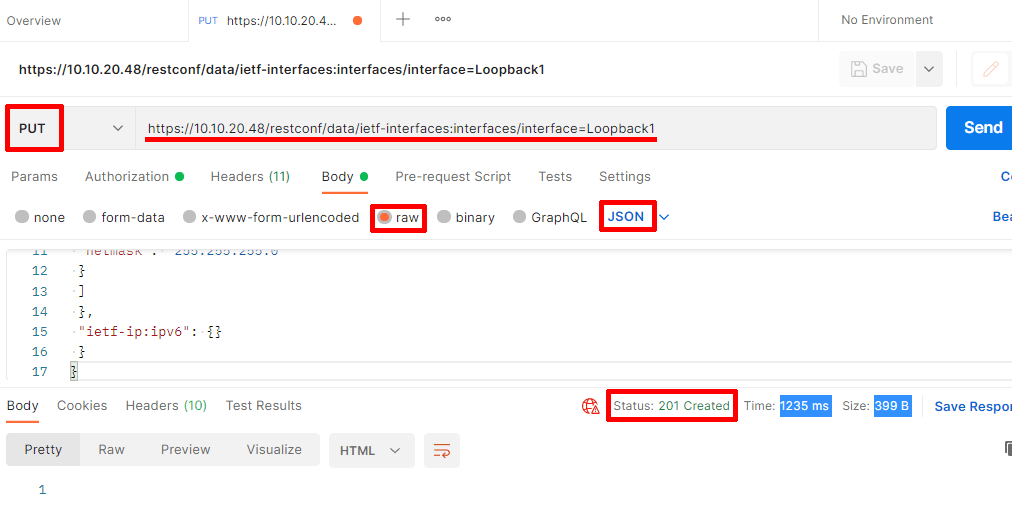 Меняем GET на PUT, URL https://10.10.20.48/restconf/data/ietf-interfaces:interfaces/interface=Loopback1, а на закладке Body: