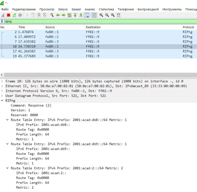 - Интерфейс начинает рассылать обновления RIPng на адрес FF02::9 (кроме маршрутов, которые были получены через этот интерфейс, правило Split Horizon);
