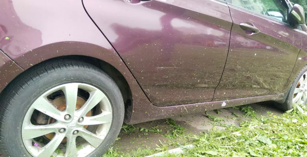 Это ещё не всё, выходишь, твоя машина снизу доверху в “зелёнке”, даже крыша. Уточню, в прилипшей “зелёнке”. Просто так смахнуть тряпкой не получится. А если постоит на солнце часок-другой, зажарится, потом даже керхером не отмоешь. Услышал покос, бежи скорее переставлять машину! Пока её всю не “обзеленили”.
