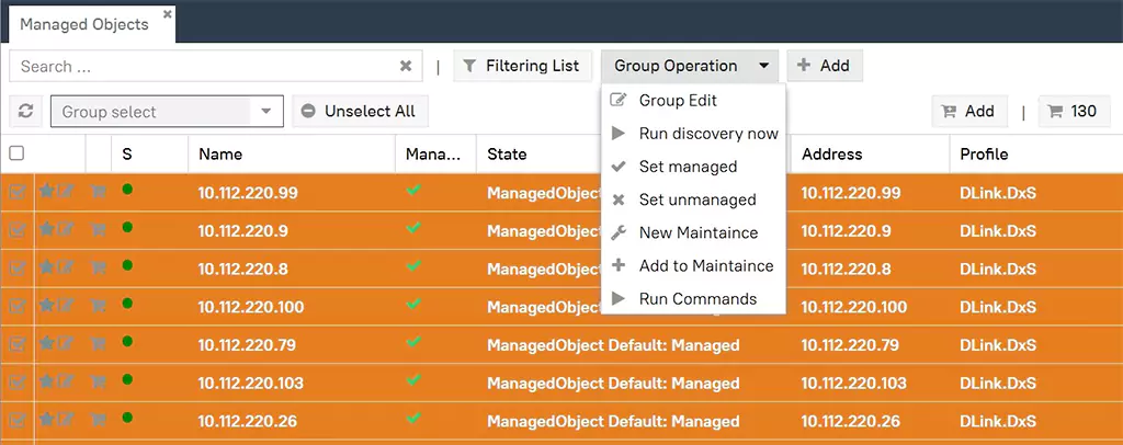 После выбора загорается (становится доступным) пункт Group Operation. Там много всего, фича последних версий NOC, раньше было не так. Подчёркиваю, у нас групповое редактирование (Group Edit). Выполняю сразу для всех выбранных записей, а именно добавляю (пишу очень упрощённо, чтобы было более-менее понятно):
