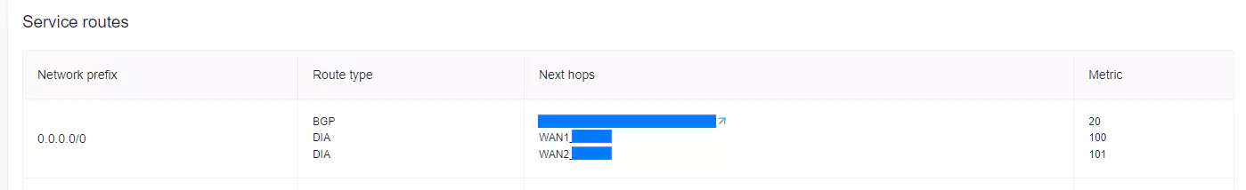 DIA (Direct Internet Access) заключается в следующем, на каждом CPE выход в интернет из LAN реализован сразу и не требует начальной настройки. То есть, если у нас есть WAN канал, на него автоматически вешается дефолтный маршрут. Самое прикольное, что DIA создаётся даже когда WAN каналы MPLS и не имеют выхода в интернет. Автоматическое действие, не разбирается что там за WAN канал.